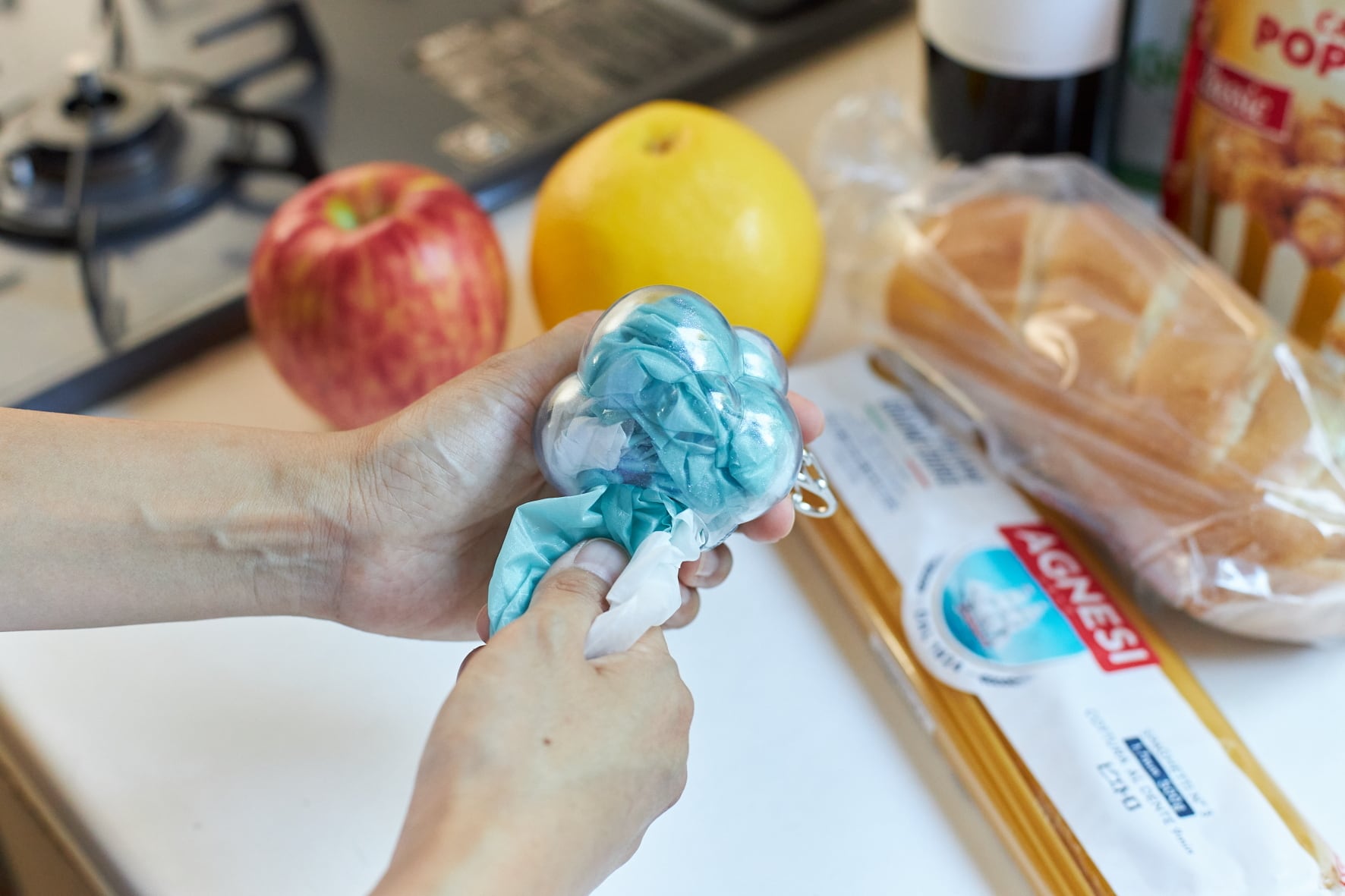 「bagble (バグブル)」は、シャボン玉をぶくぶく吹いたときにできる小さな泡をイメージしたソフビ素材のケースにエコバッグを収納したアイテムです。