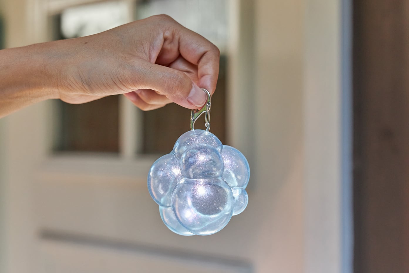 日本製ソフビフィギュアと同じ製法で作られたケースは、手になじむやわらかな質感で、エコバッグの出し入れもスムーズです。透明素材に数色のラメを加えることで、見る角度によってシャボン玉のようにさまざまな色に輝きます。