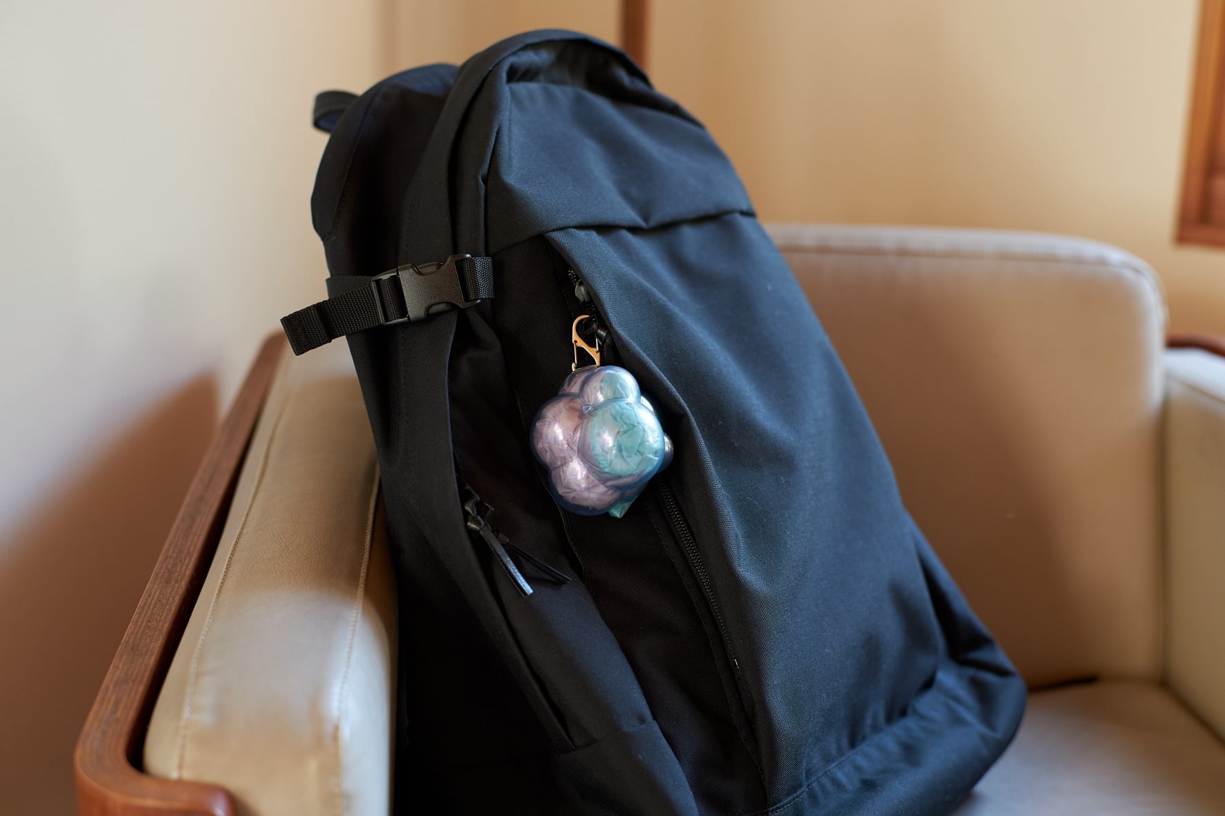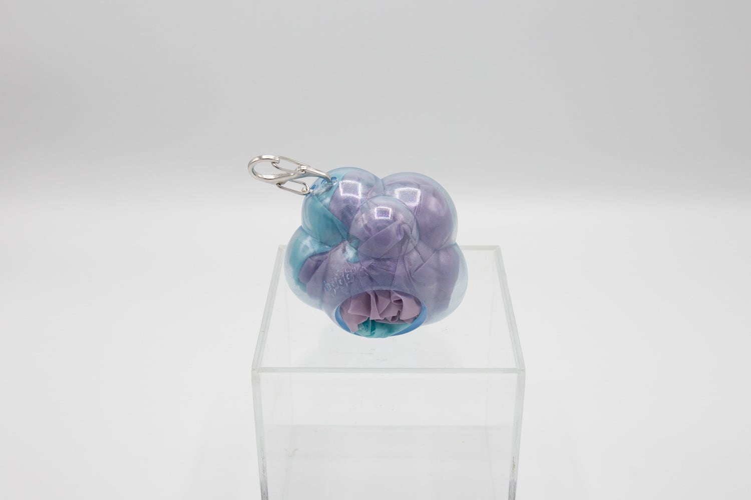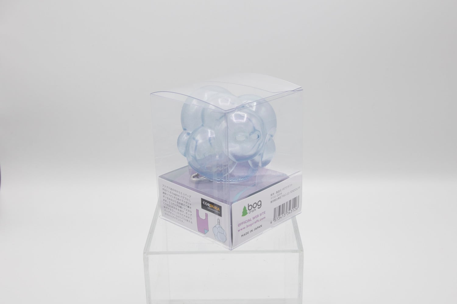 日本製ソフビフィギュアと同じ製法で作られたケースは、手になじむやわらかな質感で、エコバッグの出し入れもスムーズです。透明素材に数色のラメを加えることで、見る角度によってシャボン玉のようにさまざまな色に輝きます。